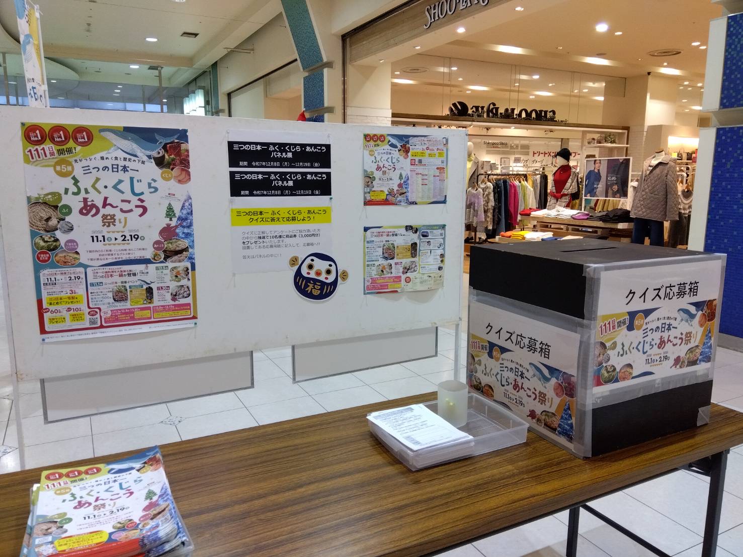 11月1日より令和8年2月19日まで、「第5回 三つの日本一 ふく、くじら、あんこう祭り」を開催中ですが、特に地元下関の皆さんに歴史や栄養素、日本一の理由をもっと知ってもらい、下関の食に誇りを持ち、情報発信をしていただくことを期待して、本日12月8日から「三つの日本一 ふく、くじら、あんこうパネル展」を開催しています。合わせて、期間中クイズに正解し、アンケートにご協力頂いた方の中から抽選で10名様に商品券(3,000円分)をプレゼントします。皆様のご参加をお待ちしております。