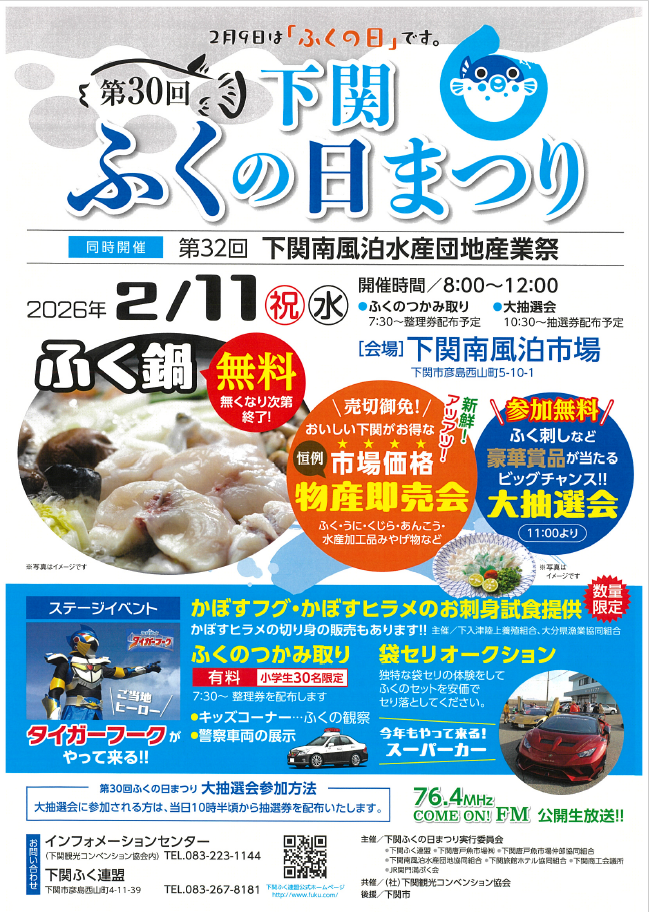 ふくの取扱量日本一を誇る下関の南風泊市場内で、第30回 下関ふくの日まつりが開催されます。「ふく鍋」の無料振る舞いや、ふく、くじら、あんこう、うに、水産加工品みやげ物など、売り切れ御免の物産即売会、ふく刺し等、豪華賞品が当たる参加無料の大抽選会、毎年人気のふくのつかみ取り(有料/小学生30名限定)。ステージイベントとしては全国的に珍しい袋セリオークションを体験してふくのセットを安価で手に入れる企画などを実施されます!
